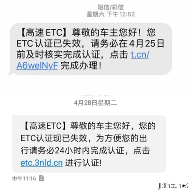 4月22日,小康收到一个陌生号码发来的短信,称其办理的ETC需要认证,让他点击一个链接完成认证。由于小康刚办理ETC不久,他并没有怀疑就点击链接进去了。