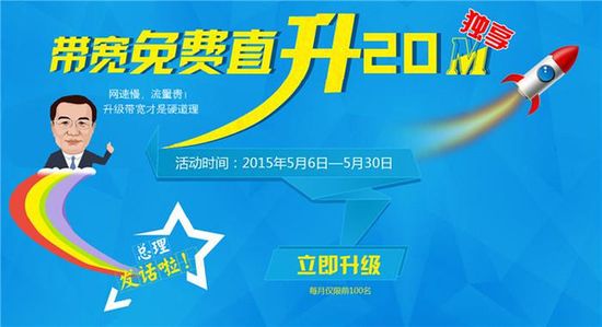 “互联网+”经济形态与“大众创业、万众创新”战略在当下的融合共进,张彦华紧跟社会发展趋势,响应总理号召,提出免费升级20M独享活动,让用户真正享受极速的网络带宽体验。以电信为代表的运营商积极响应李克强总理,纷纷进行“宽带提速”,理论上将大幅度提高个人用户的宽带速度。实际情况是倘若不提高机房服务器带宽的速度,想要真正提高用户的网速是很困难的。因此,天互数据再次敢于创新,提出为用户免费升级20M独享带宽,为“全民宽带提速”的行动提供有力的基础保障。有天互20M独享,总理再也不用担心网速慢啦!