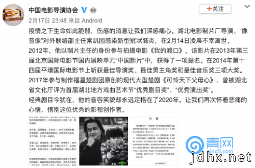 17日晚,中国电影导演协会发文缅怀因感染肺炎去世的湖北电影制片厂导演常凯,“疫情之下生命如此脆弱,伤感的消息让我们深感痛心。”