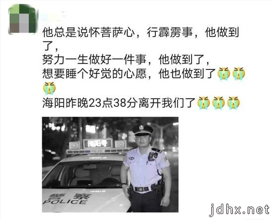 陈海阳的好友与战友们写道:“愿天堂不再有病痛,兄弟一路走好,警察工作忙碌,但你从不言累,你(曾)说因为热爱,所以快乐,因为快乐,所以无悔。”