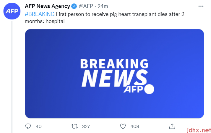 法新社刚刚消息,美国马里兰大学9日表示,全球首个接受猪心脏移植的病患在术后两个月死亡。