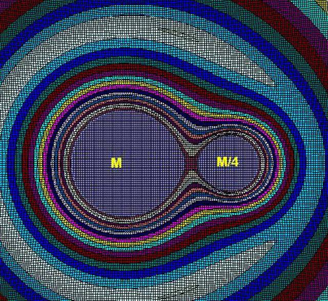 希尔球,是指行星能够主要控制附近的天体(如卫星),而不被其它较大天体(如恒星)所控制的范围------举个例子,使各行星间的 “希尔球”半径就像高速公路上的安全车距,而超级黑洞的存在,可以让这些飞驰的汽车稳定保持1m不到的车距。