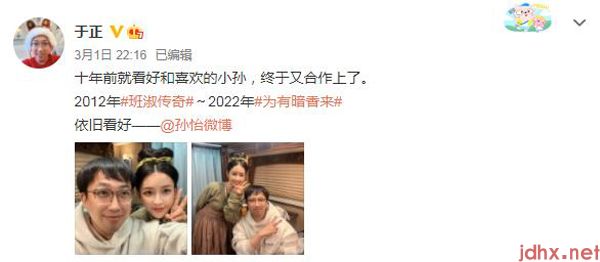 3月1日,于正微博晒与孙怡合影,并配文:“十年前就看好和喜欢的小孙,终于又合作上了。2012年班淑传奇~2022年为有暗香来,依旧看好——孙怡。”照片中,孙怡身穿戏服,两人开心比耶,让网友直呼“爷青回”。