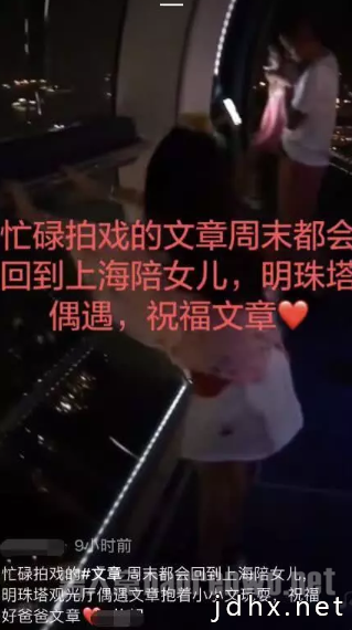 9月29日,有网友晒视频称在上海明珠电视台偶遇了文章,文章独自带女儿出游。据悉,文章虽然在忙着拍戏,但是每周末都会回上海陪伴女儿,这次更是独自带两个女儿出游。视频中,文章身穿白色T恤搭配短裤造型简单,大女儿爱马身穿长袖外套搭配白色短裙站在爸爸身边,小女儿则被文章抱在怀中观看窗外美丽的上海夜景。小女儿被爸爸放下后还牵着爸爸的手不停撒娇,两人感情十分好,全程未见马伊琍身影,想来是文章独自带女儿出来玩。2019年7月28日,文章与马伊琍宣布离婚。