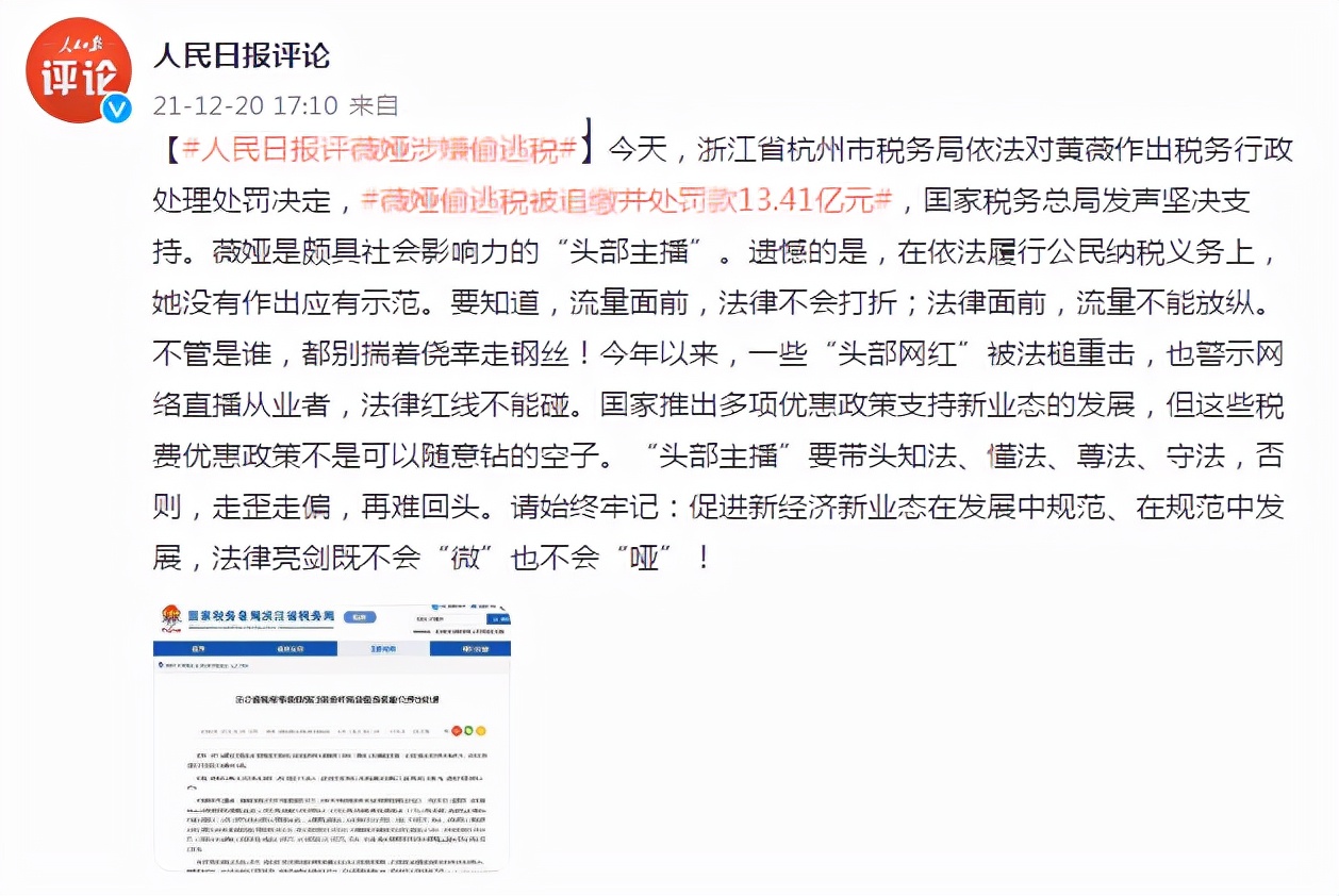 对于薇娅的偷逃税行为,人民日报发表评论:薇娅偷逃税被处罚是一记警钟,无论名气再大、人气再高,一旦偷逃税就难逃制裁。身为头部主播,更该带头守法。享受新业态带来的制度红利,就须展现与之匹配的法治素养。自觉依法纳税,法治轨道内的流量变现才有意义,规范发展的新业态才有未来。