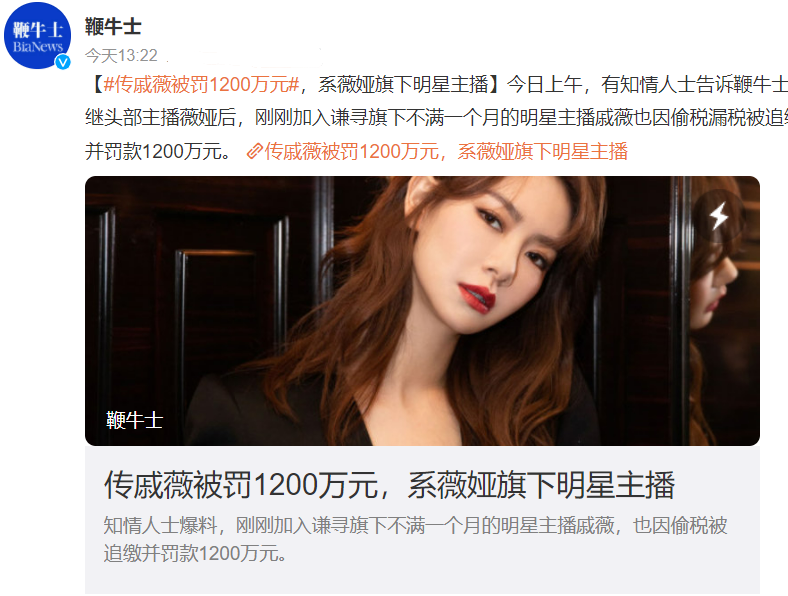 12月21日,一位名叫“鞭牛士”的用户爆料称戚薇因偷逃税被追缴并处罚款1200万元。很快,“鞭牛士”的爆料被一些财经媒体报道,戚薇被送上了热搜。