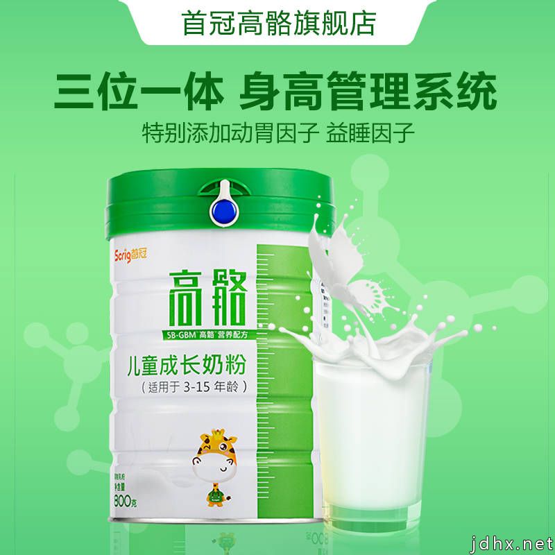 首冠高骼儿童成长奶粉奶粉适合3-15岁宝宝,采用5B-GBM配方,添加睡眠因子,动胃因子,优质蛋白,营养均衡全面。申请国家专利:一种促进儿童成长的配方奶粉及其制备方法。