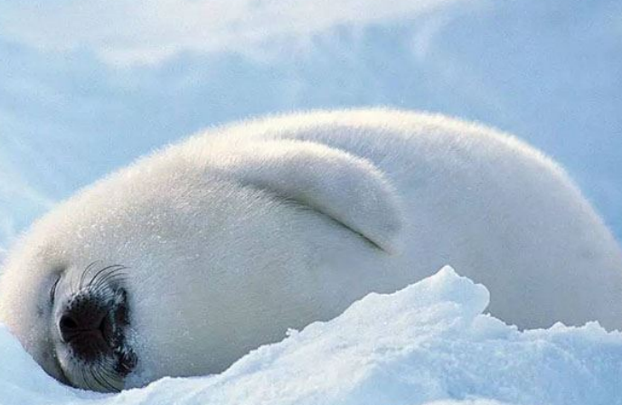 格陵兰海豹的数量正在逐渐减少,这是一种非常漂亮的野生动物,有着雪白的毛发,笑眯眯的眼睛。样子极为可爱。