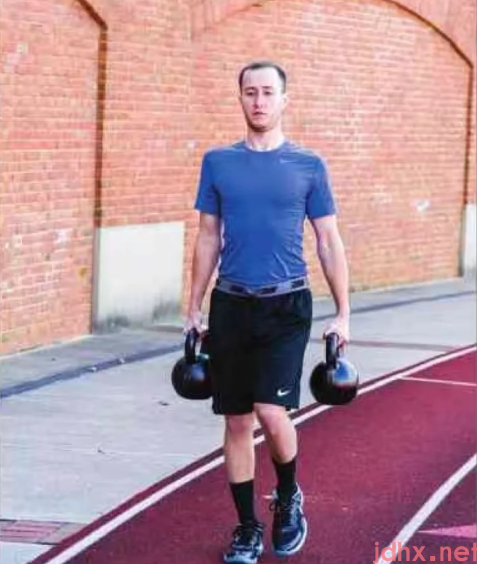 5.握紧重物,以慢速和可控的步伐向前行走。