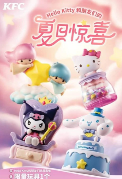 每年八月份的时候,肯德基都会推出新系列的玩具套餐,也就是夏季限定玩具套餐,今年也不例外,根据最新信息显示,今年肯德基将会在8月6日推出夏季限定hello kitty和她的好朋友们的玩具套餐,里面会有四款不同的玩具,分别是凯蒂猫、玉桂狗、双子星以及库洛米等。