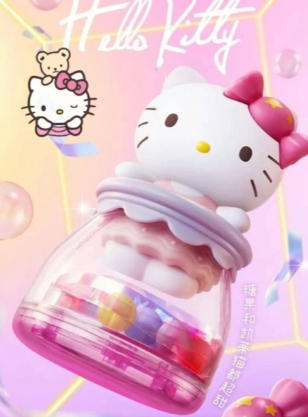 1、Helloitty糖果罐,装满超蜜!功能:透明的偏果罐,轻轻混动,炫彩的砂糖和彩带一起碰撞!