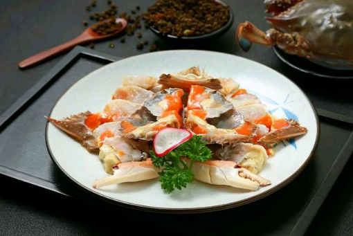 第四步是取出腌制的梭子蟹,切成块,然后与料酒、醋、酱油、姜、蒜和芥末混合。把梭子蟹浸在里面吃。