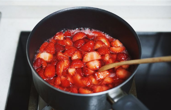 3.大约三分钟后,草莓会轻微萎蔫,可以从锅中取出。草莓将在4℃的冰箱中冷藏。美味、酸甜的煮草莓就形成了。