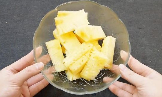在吃菠萝之前,你应该清洗菠萝的果皮和刺,然后把果肉切成块,浸泡在稀释的盐水或糖水中。食用前将糖苷浸泡在菠萝中。如果不经处理直接食用,不仅会影响菠萝的口感,菠萝中所含的糖苷还会对口腔黏膜造成刺激。